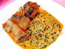 Our entrees showcased the essential fundamentals of down-home Nigerian fare. Although the variety of ingredients change from one end of the country to the other (north to south and east to west), most Nigerians will agree that the main meal of the day will consist of a fragrant and spicy tomato or palm-oil based stew, with deep green spinach or spinach-like vegetables, often with ground pumpkin seed (egusi) or ground peanuts, partnered with beef, goat, lamb, fish, or chicken (and all the parts of these fine animals playing key roles in one dish or another). That stew is captured and transferred to your mouth by means of the first three fingers of your right hand, breaking off and forming a kind of scoop of the hearty carbohydrate provided - corn fufu (almost exactly like polenta, except a bit stiffer), pounded yam (like mashed potatoes but with the consistency of silly putty), or cassava (source of tapioca, but also mashed potato-ey in this incarnation). Plantains - which look like bananas but act like potatoes, are another key carbo option. Jollof Rice, from which our Louisiana counterparts evolved their redoubtable Red Beans and Rice dish, is a rightly famous Nigerian option, eaten with less sauce, with the meat on the side. Note - the carbs are the core - this meal is meant to fill you up. As such, the meat and stew are actually more of a garnish, the flavor-enhancer, the icing on the cake, as it were.